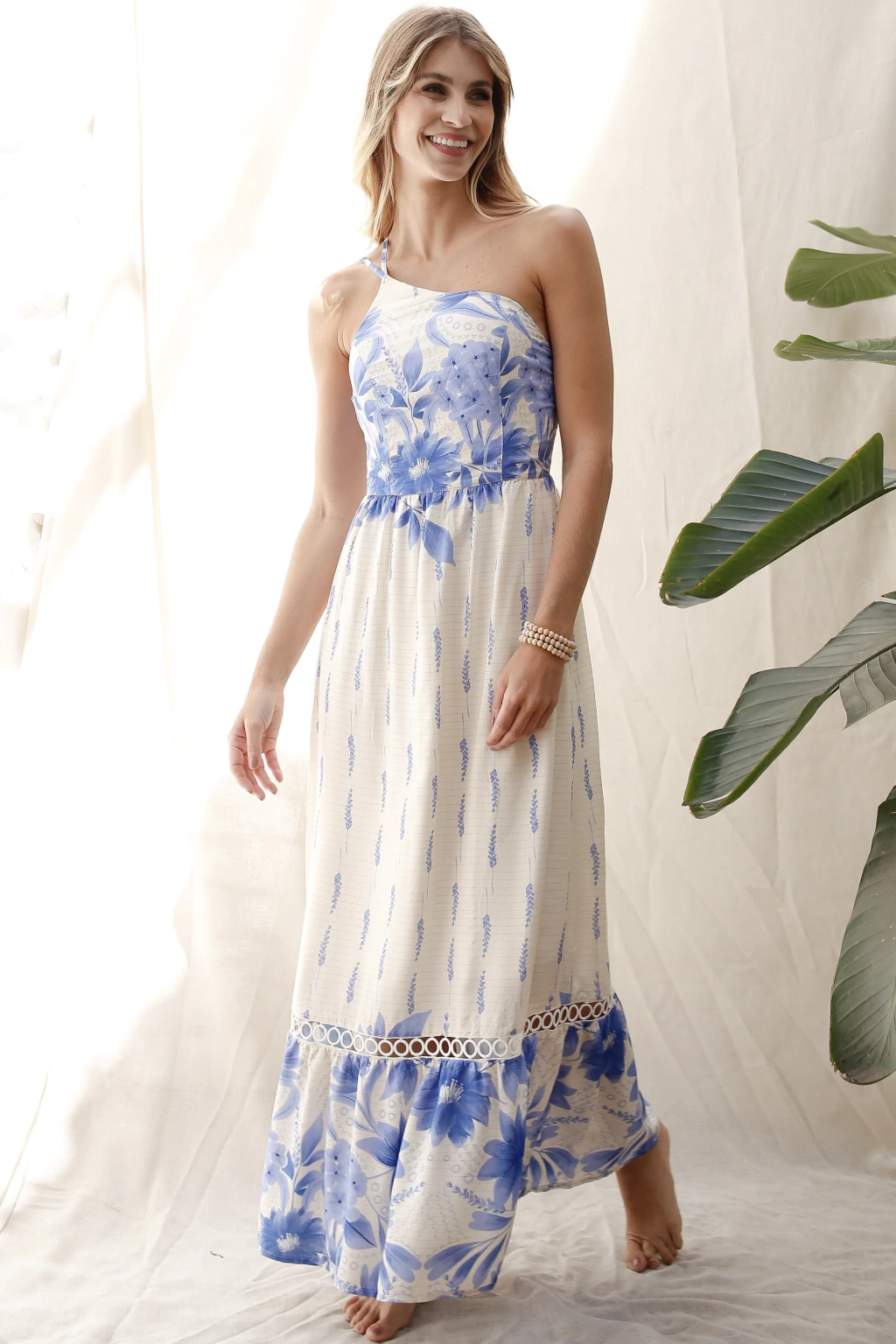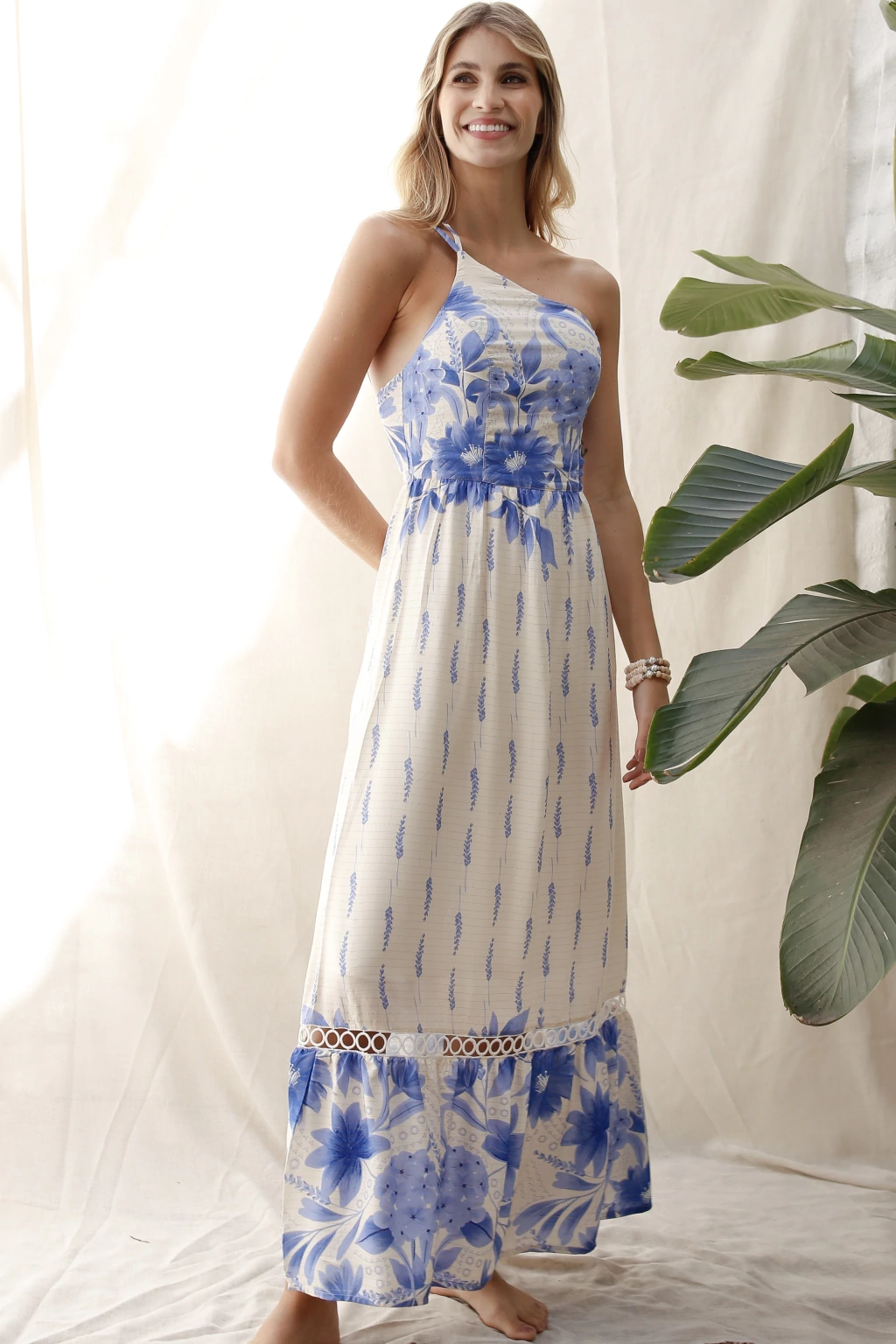 Vestido um ombro só de alças reguláveis, fios de lurex e com detalhe de entremeio de algodão no barrado. Possui forro de viscose.